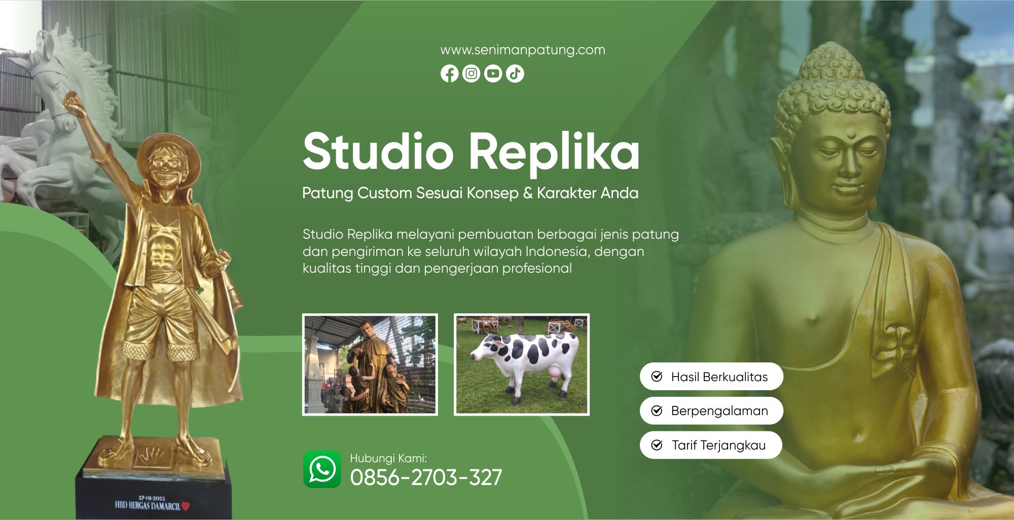 Dengan tim profesional, bahan berkualitas, dan pengalaman bertahun-tahun, Studio Replika siap membantu Anda mewujudkan patung fiber, patung perunggu, patung kuningan, patung tembaga, relief, diorama, maskot, tugu kota, hingga karya monumental lainnya yang memancarkan karakter kuat dan estetika luar biasa.